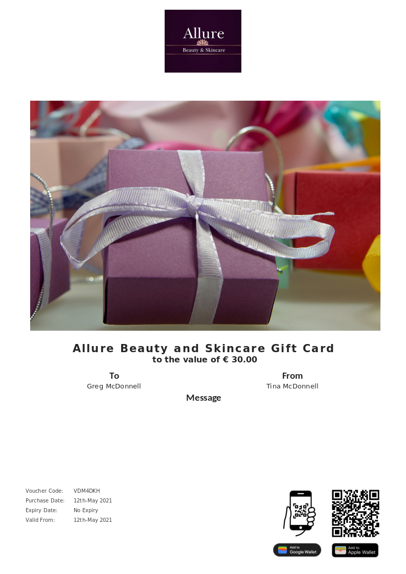 Allure Beauty and Skincare allows you to purchase instantly printable gift vouchers, special offers and tickets using the Voucher Connect platform.